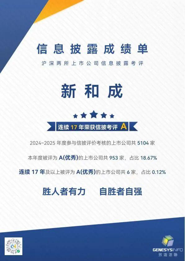 近日,深圳證券交易所公布了深市上市公司2024~2025年度信息披露考評結果,新和成以整體運作規(guī)范、高質(zhì)量的信息披露再次獲得最高評級A。目前,僅有6家上市公司連續(xù)17年獲此殊榮,占比0.12%,新和成位列其中。這一成績不僅彰顯監(jiān)管部門、市場與投資者對新和成信息披露質(zhì)量、公司治理規(guī)范的高度認可,更是公司具備長期投資價值的有力印證。